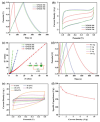 As energy storage and conversion devices, supercapacitors have both the characteristics of conventional capacitors and the batteries that can charge and discharge of capacitors rapidly and store energy. Recently the MOF-derived porous carbon materials have proved to show great potential in high-performance supercapacitors because of their unique structures and heteroatoms doping [51-53]. To evaluate the electrochemical properties of MOF-derived porous carbons, electrochemical experiments were carried out using a three-electrode system in 6 mol/L KOH electrolyte under the potential window of -1 V to 0 V. The CV and GCD curves of MOF-derived porous carbons electrodes conducted at different potential scan rates and current densities are shown in Fig. 5. The NPMOF-700 displays a distorted rectangular CV shape, whereas other electrodes present quasirectangular CV shapes (Fig. 5b). The distorted rectangular CV shape indicates the ion-diffusion limitation in micropores [54]. The CV curves of NPMOF-800 electrode at varied scan rates from 5 mV/s to 100 mV/s retain relatively rectangular shapes, indicating good charge propagation with excellent rate capability (Fig. 5e). In order to evaluate the specific capacitance of the MOF-derived porous carbons electrodes, galvanostatic charge-discharge measurements were conducted at various current densities in a three-electrode system. All of the electrodes display a quasi-linear appearance with a slight bend, implying the pseudocapacitance impact derived from N/O doping. It is well known that the presence of some heteroatom (N, O, P, S, etc.) functionalities can enhance the capacitance by the pseudo-capacitive effect [55, 56]. As shown in Fig. 5a, the specific capacitance values obtained at a current density of 1 A/g are 66 F/g (NPMOF-700), 220 F/g (NPMOF-800) and 207 F/g (NPMOF-900), respectively. These values are among the previously reported high capacitances of MOF-derived porous carbon electrodes (Table S4 in Supporting information) [31, 36-58]. Fig. 5a shows the charge-discharge curves at 1 A/g. NPMOF-800 is at a premium due to its larger surface area and pore volume. The specific capacitance of NPMOF-700 is only 66 F/g at a current density of 1 A/g, while it drastically increases to 220 F/g and 207 F/g for NPMOF-800 and NPMOF-900. Nyquist plots are applied to gain an insightful understanding of the ion-diffusion and charge-transfer behaviors within electrodes (Fig. 5c) [54]. For each sample, the Nyquist plot showed a small semicircle at high frequency and a linear trait at low frequency. At low frequencies, the vertical curve is featured, indicating a nearly ideal capacitive behaviour. The equivalent series resistance (Rs) calculated from the intercept point at the Z′-axis, are 0.50 Ω, 0.51 Ω and 0.53 Ω for NPMOF-700, NPMOF-800 and NPMOF-900 electrodes, respectively. The semicircle diameter represents the charge transfer resistance (Rct), the fitted Rct value of NPMOF-700 is 3.9 Ω, which was much higher than the value of NPMOF-800 (0.59 Ω) and NPMOF-900 (0.54 Ω), indicating lower speeds of electron transfer and ion transport. The charge transfer resistance is too high for NPMOF-700, which is the main reason leading to its poor performance. Additionally, the straight line of the Nyquist plot represents the warburg impedance (W). Clearly, the Rct (0.59 Ω) and W (0.42 Ω) for NPMOF-800 can ensure the efficient electron transfer and fast ion diffusion.