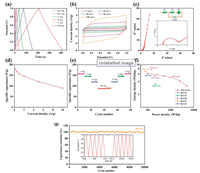 | Fig. 6. Electrochemical performances of NPMOF-800 electrode measured in a two-electrode system using 6 mol/L KOH electrolyte: (a) GCD curves at different current densities. (b) CV curves at different scanning rates. (c) Nyquist plot. (d) The relationship between current densities and capacitances. (e) Rate performance measurements. (f) Ragone plot. (g) Cycling stability at 1 A/g. | |
