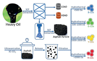Petroleum plays a crucial role in global economics and is served as the major energy sources. The oil consumption accounts for about 34% of the world's total fuel consumption in 2016 and 2017, and the Brent spot crude price is 54.19 $ per barrel in 2017 [1]. The depletion in the world's supply of light crude oil and the oil supply shifting to heavy crudes have made these heavy crude oils became important feedstocks [2]. The world heavy oil resource is comprised of about 210 billion barrels of unproved reserves and 299 billion barrels of original reserves [3]. Heavy crudes have poor properties and are more difficult to be processed through conventional technologies such as catalytic cracking, hydrocracking [4-8]. The selective utilization of heavy oil fraction through a prior solvent separation process is widely concerned in refining industry, including solvent deasphalting (SDA) [7-9], the supercritical fluid extraction (SFE) [10, 11] and selective asphaltene extraction (SELEX-Asp) process [12] developed by our research group. Although the processability of extracted fractions were significantly increased, SDA produces a large amount of low value-added de-oil asphalt (DOA), which can be produced in the form of solid particles through granulation [13]. Asphalt consists of larger molecules with high aromaticity and abundant heteroatom (nitrogen, oxygen, and sulfur) [14] and metal (notably nickel and vanadium) contents. The chemical characteristics lead to many upgrading problems such as high yields of coke and catalyst poisoning during processing [7, 15, 16]. It is therefore to seen that high-valued processing and utilization of asphalt are still an important problem facing the petrochemical industry.