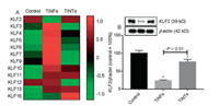 | Fig. 2. The changes of KLF family. Endothelial monolayer was incubated with cell culture medium (control), 64 μg/mL TiNFs or TiNTs for 24 h. (A) The heat-map was made based on average FPKM values of KLF genes. These KLF genes were expressed in at least one group (FPKM values larger than 1 were considered as expressed). (B) Western blot was used to measure the protein levels of KLF2. *P < 0.01, compared with control. | |