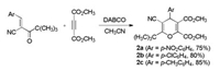 In order to develop the scope of the reaction, ethyl cyanoacetate and pivaloylacetonitrile was also used in the reaction. However, DABCO promoted reaction of ethyl cyanoacetate with dimethyl but-2-ynedioate in acetonitrile resulted in a complicate mixture of the products, from which no main product was obtained. The similar reaction of pivaloylacetonitrile with dimethyl but-2-ynedioate in acetonitrile in the presence of DABCO gave the known dihydropyran derivative 2a-2c in 75%–85% yield, which have been prepared by 4-(N, N-dimethylamino)pyridine catalyzed reaction of pivaloylacetonitrile with dimethyl but-2-ynedioate in dimethoxyethane (Scheme 3) [18]. On the other hand, DABCO catalyzed reaction of methyl or ethyl propiolates with benzylidene malononitrile gave the known dimethyl or diethyl hex-2-en-4-ynedioates, which were derived from the base catalyzed dimerization of alkyl propiolates [62]. These results indicated that formation of the hexasubstituted benzene derivatives required the precise matching of the reactivity of the substrates.
