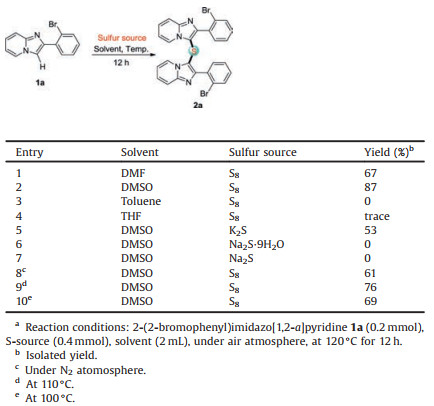 Initially, the reaction was carried out by treatment of imidazo[1, 2-a]pyridines 1a with sulfur powder in 2 mL DMF at 120 ℃ under air atmosphere (Table 1). To our delight, the desired product 2a was isolated in 67% yield (entry 1). To enhance the reaction efficiency, other solvents were then examined. As shown in Table 1, three solvents including DMSO, toluene, THF (entries 2–4) were investigated, and DMSO was found to be the most effective solvent, giving desired product 2a in 87% yield (entry 2). We also tested various sulfur sources, and sulfur powder showed the best result (compare with entries 2, 5–7). A series control experiments indicated that the reaction did not take place when Na2S or Na2S·9H2O were used as the sulfur source. However, when K2S was used in the present transformation, the reaction could proceed and delivered a 53% yield. Interestingly, the yield decreased to 61% under N2 atomsphere (entry 8), which showed that O2 plays an important role in the present transformation. Finally, decreasing the reaction temperature resulted in a lower conversion (entries 9 and 10).