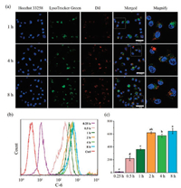 In order to analyze the behavior of EW NPs in cells, Dil was applied to mark the nanoparticle and lysosome was labelled using green fluorescence dye. As shown in the CLSM images (Fig. 3a), after incubation for 1 h, a lot of NPs distributed around cell nucleus, and the fluorescence of NPs located in the lysosome site, suggesting the successful internalization and captured by endo-lysosomes. Increased fluorescence intensity could be observed after incubating for 4 h, and then almost maintained at a relative stable status within 8 h. This could initially judge that the uptake balance was reached within 4 h. Additionally, the cellular uptake was quantitatively confirmed by flow cytometry (FCM). As illustrated in Figs. 3b and c, uptake phenomenon occurred quickly after incubate, and the absorption equilibrium was reached within almost 2 h.
