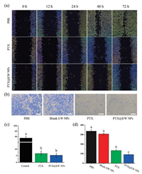| Fig. 4. (a) Representative wound healing images after scratch incubation with PBS, PTX and PTX@EW NPs for 72 h. (b) Representative images of invasive CT26.WT cells treated with PBS, blank EW NPs, PTX and PTX@EW NPs, respectively. Scale bar: 100 μm. (c) Wound healing ratio after treatments with PBS, PTX and PTX@EW NPs for 72 h. (d) Quantitative analysis of the invasive CT26.WT cells treated with different formulations. Different letter in superscript on the bar graph indicate significant at 0.01 level by Tukey's test. | |
