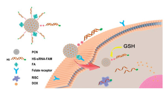 The confocal laser scanning microscopy (CLSM) was applied to investigate the cellular uptake and bio-interaction of surface modification on PCN-siRNA-DOX-FA complex, the fluorescence of FAM and DOX was used to study the cellular uptake and interaction status. DOX and FAM presented different imaging morphology through their different biological effect. DOX was more concentrated in the nucleus structure in cells, while FAM was present in the cytoplasm with the modified siRNA. Hela cells were co-cultured with PCN-DOX-FA, PCN-siRNA-FA, PCN-DOX-siRNA and PCN-siRNA-DOX-FA for 5 h. As shown in Fig. 3, although the DOX channel of PCN-DOX-FA group have shown red fluorescent signal under the FA mediated cellular uptake, the weaker fluorescent signal indicated that the low loaded amount of DOX due to the lack of siRNA structure modification. Meanwhile, the stronger green fluorescent signal of FAM channel was observed in PCN-siRNA-FA group, which proved the complex was uptake and released in the cytoplasm. However, without FA modification, PCN-DOX-siRNA group have shown the nearly black fluorescent signal both in FAM and DOX channel, which suggested the cellular uptake rate correlation with FA. On the other hand, relative to PCN-DOX-FA and PCN-siRNA-FA, PCN-siRNA-DOX-FA group have shown more stronger fluorescence intensity in both FAM and DOX channel, indicated that the delivery efficacy was mostly depended on the assistance of FA, and the release process of bio-thiols response could further reduce the effect of aggregation-induced quenching (ACQ) effect on fluorescence intensity. Furthermore, PCN-siRNA-DOX-FA complex co-cultured with the folic acid receptors low-expressed cell lines (MCF-7, HUVEC), also shown the lower fluorescent signal in FAM and DOX channel (Fig. S6 in Supporting information), proved the internalization of complex into targeted cells was occurred when surface was modified with FA and FA receptors were available on target cells.