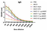 IgG antibodies of the antisera were first evaluated by ELISA. As shown in Fig. 3, the IgG response of MUC1-Alum, MUC1-CFA and MUC1 groups was low, while both of the four groups with STING agonist diABZI showed significant IgG responses. Among the STING agonist diABZI adjuvanted groups, MUC1−10 μg diABZI and MUC1−30 μg diABZI elicited almost identical IgG titers, while the titers induced by MUC1−0.1 μg diABZI and MUC1−1 μg diABZI candidates were low. This was consistent with the end-point titers of these vaccine candidates (MUC1−30 μg diABZI, 25, 600; MUC1−10 μg diABZI, 25, 600; MUC1−1 μg diABZI, 12, 800; MUC1−0.1 μg diABZI, 6400) (Table S1 in Supporting information). These results indicated diABZI increased antibody titers in a dose dependent fashion, and 10 μg diABZI might be the optimum dose.