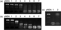 | Fig. 2. Agarose gel electrophoresis retardation of pDNA by (a) TEPA-CD, (b) HA-ADA/TEPA-CD polysaccharide nanoassembly at N/P ratios of 5, 10, 30, 60, 70, 80 and 90 from lane 1 to lane 7, respectively, (c) HA-ADA/TEPA-CD polysaccharide nanoassembly with pDNA before (lane 1) and after (lane 2) treated with HAase at the N/P ratio of 80. | |