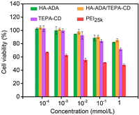 | Fig. 3. Cellular viability of 293 T cells after the treatment with HA-ADA, HA-ADA/TEPA-CD, TEPA-CD, PEI25k at different concentrations in 48 h. | |