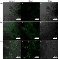 | Fig. 4. Confocal fluorescence images of 293 T cells transfected with (a) TEPA-CD, (b) HA-ADA/TEPA-CD at N/P ratio of 80, and (c) PEI25k at N/P ratio of 10 for 48 h. | |