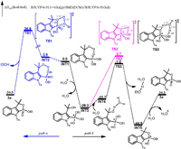 Inspired by the control experiments and previous reports [15], a plausible mechanism of this transformation was depicted inScheme 5. Initially, 2a could be converted to a phosphonyl radical by the oxidation of Mn(OAc)3·2H2O. Subsequently, the formed phosphonyl radical could attack C2 of 3-indolymethanols to yield a radical adduct, which could further undergo deprotonation to afford intermediate A. An intramolecular H-bonding interaction O-H···O is found in the intermediate A according to DFT calculations. Next, a possible direct intramolecular nucleophilic cyclization of A to afford the desired product 3aa was considered computationally (path a, Fig. 1). The corresponding transition state (TS) is located as TS1, in which the O···P distance is shortened to 1.98 Å along with the trend of dissociation of EtOH. The predicted ΔG≠ for direct cyclization is 34.2 kcal/mol, suggesting that this step is not ready to occur. One may suggest that in situ generated HOAc might assist the intramolecular nucleophilic cyclization of A. This possibility was also considered. However, even higher activation barrier is found for this cyclization step when a HOAc molecule is present H-bonding with A. Alternatively, one may propose that the hydroxyl group of A could be protonated and hence to afford a cation after dehydration. Interestingly, computational results suggest that O atom of P=O moiety is more ready to be protonated than the hydroxyl group and thus INT3 is formed (path b, Fig. 1). Afterward, the aforementioned intramolecular nucleophilic cyclization is considered and the corresponding TS is shown as TS2. The predicted ΔG≠ for the cyclization of INT3 is 28.9 kcal/mol, which is substantially lowered than the direct cyclization of A. The protonated phosphite group becomes more electrophilic and thus the cyclization of INT3 is ready to occur. When a water molecule is present and H-bonding with INT3, the calculated activation barrier decreases further (27.2 kcal/mol). Finally, the deprotonation of the formed INT5 is followed to yield the product 3aa. According to the computational analysis, a plausible mechanistic pathway is depicted in Scheme 5. The phosphite cation (B), instead of carbon cation (F), is suggested to be the key intermediate in the subsequent cyclization to afford the desired product.