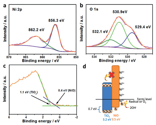 | Fig. 2. High-resolution XPS spectrum of (a) Ni 2p and (b) O 1s of TiO2@NiO NRAs. (c) Valance XPS spectrum of TiO2@NiO NRAs. (d) Energy diagram of TiO2@NiO NRAs. | |
