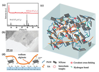| Fig. 1. (a) XRD patterns and (b) transmission electron microscopy image of MXene. (c) MXene-based hydrogel network diagram. (d) Description of hydrogen bonding between MXene and PAM, SA and covalent cross-linking of PAM chains. | |