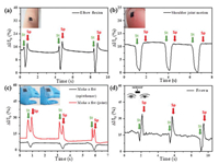 Fig. 4a shows the relative current response to elbows flexion and Fig. 4b displays the electromechanical performance of the strain sensor to shoulder joint motions. Clear and sharp changes in relative current variations are demonstrated, showing accurate response to large-scale human movements. Furthermore, the strain sensor can instruct the discrepancy in movement of muscles and human joints under the same gesture, providing an alternative solution for robot motion capture. In Fig. 4c, the sensor is adhered to the opisthenar and joint separately to indicate the electromechanical performance when making a fist. The relative current variation shows two typical peaks to indicate the deformation and resilience of the joint, while the muscles merely display a single peak wave to explicate the movement. When placed at the eyebrow, distinct rise and decline in relative current variation appears in Fig. 4d, exhibiting promising application for facial expression identification.