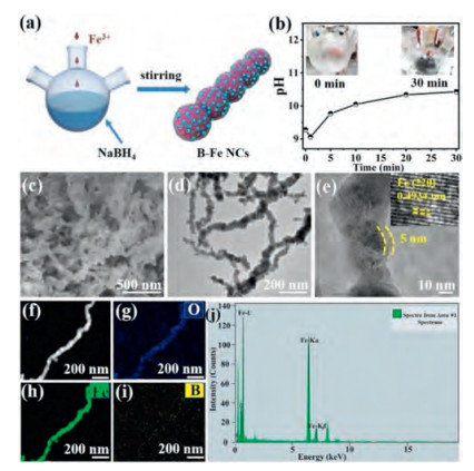 | Fig. 1. (a) A schematic fabrication process of the B-Fe NCs-x. (b) The pH values of solution changes with reaction time after adding FeCl3 aqueous solution into sodium borohydride aqueous solution (inset are optical Photographs of B-Fe NCs catalyst preparation process for 0 min and 30 min). (c) SEM, (d)-(e) TEM images of the B-Fe NCs (inset is HRTEM image in panel (e)). (f)-(i) STEM elemental mapping images, and (j) the corresponding EDX spectra of B-Fe NCs. | |