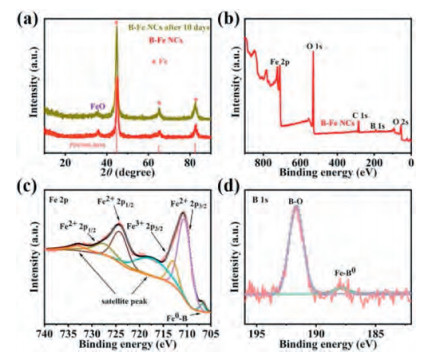 | Fig. 2. Characterizations of B-Fe NCs. (a) XRD patterns. (b) XPS survey spectra. (c) High-resolution Fe 2p XPS spectra, and (d) high-resolution B 1s XPS spectra of B-Fe NCs. | |