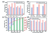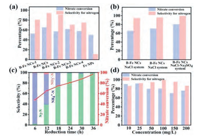 | Fig. 3. (a) Nitrate conversion and nitrogen selectivity of B-Fe NCs-x and Fe NPs cathodes in 0.02 mol/L NaCl electrolyte containing 100 mg/L NO3−-N at −1.3V applied potential for 24h. (b) Nitrate conversion and nitrogen selectivity of the B-Fe NCs with different conditions (The two leftmost columns: the deionized water without deoxidized; The middle two columns and the two rightmost columns: the deionized water with deoxidized). (c) Nitrate conversion and nitrogen selectivity of B-Fe NCs result along with time in 0.02 mol/L NaCl and 0.02 mol/L Na2SO4 containing 100 mg/L NO3−-N at −1.3V applied potential. (d) Effects of initial nitrate concentrations in 0.02 mol/L NaCl and 0.02 mol/L Na2SO4 mixed electrolyte at −1.3V applied potential for 24h. | |