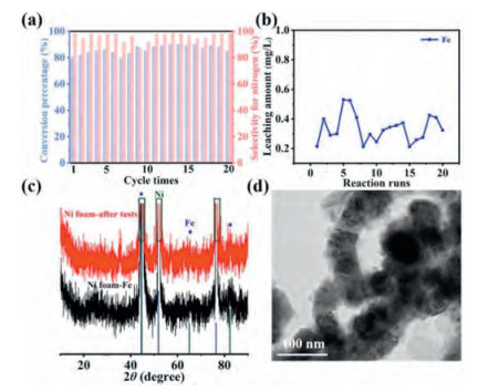 | Fig. 4. (a) Nitrate conversion and nitrogen selectivity recorded over 20 times repeated electrolysis tests (each test lasting 24 h). (b) Iron leaching amount of the B-Fe NCs cathode during 20 repeated electrolysis tests. (c) XRD pattern of B-Fe NCs after electrocatalytic reaction in 0.02 mol/L NaCl and 0.02 mol/L Na2SO4 electrolyte containing 100 mg/L NO3−-N for 24 h (The red line represents nickel foam loaded B-Fe NCs after test, the black line represents nickel foam loaded B-Fe NCs before test). (d) TEM image of B-Fe NCs after electrocatalytic reaction in 0.02 mol/L NaCl and 0.02 mol/L Na2SO4 solution containing 100 mg/L NO3−-N for 24 h. | |