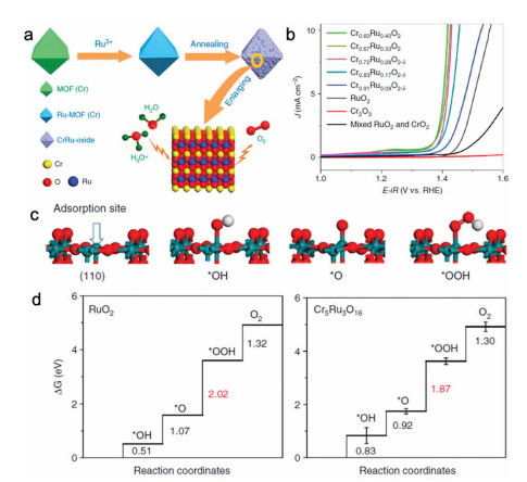 | Fig. 9. (a) Schematic illustrating the preparation of the Cr0.6Ru0.4O2 catalysts. (b) OER polarization curves of different catalysts. (c) The four-step OER process based on Cr0.6Ru0.4O2 catalyst. (d) The calculated free energy diagrams for RuO2 and Cr0.6Ru0.4O2 catalyst. Reproduced with permission [84]. Copyright 2019, Nature Publishing Group. | |