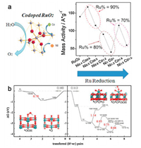 | Fig. 5. (a) Schematic illustration of the water oxidation based on Ni-Co codoped RuO2 and the mass activities of RuO2 and all codoped composites at the potential of 1.7 V vs. RHE. (b) Free energy profile of OER on (110) and (111) surfaces. Reproduced with permission [117]. Copyright 2020, American Chemical Society. | |