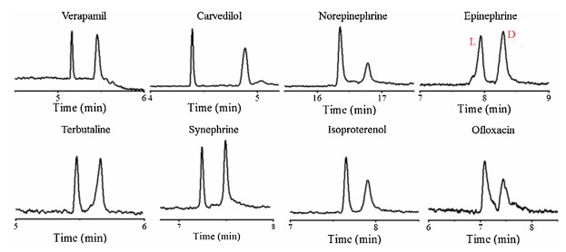 | Fig. 4. Electropherograms of eight pairs of enantiomers. The respectively optimum separation conditions are listed in Table S1. Injection: hydrostatic injection for 3 s at 10 cm height; Applied voltage: +20 kV; Detection wavelength: 214 nm; Capillary: 75 μm i.d., 40.0 cm effective length. | |
