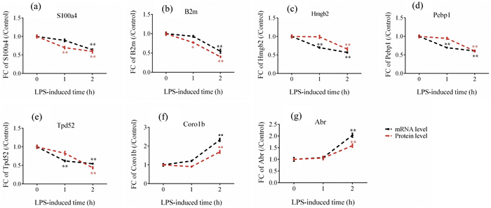 | Fig. 3. Time-dependent regulatory manner of selected proteins in response to LPS challenge. Time course of inflammatory proteins and their mRNA expression quantified by PRM and RT-PCR in CEL-treated NR8383 cells after stimulating with LPS for 1 h and 2 h. (a-g) The protein (red line) and mRNA (black) expression levels of S1004A, B2M, Hmgb2, Pebp1, Tpd52, Coro1b and Arb were quantified relative to the value obtained from control samples. Expression data were normalized to a housekeeping gene (GAPDH), Experiments were performed in triplicate and data was presented as mean±standard error of the mean. Significant differences were calculated shown with *p < 0.05, **p < 0.01. | |