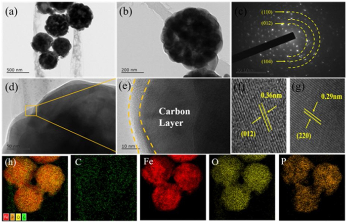 To further investigate the microstructures of multiphasic nanocomposite, TEM measurement is employed, as shown in Fig. 1. The multiphasic nanospheres are anchored on the rGO, as revealed in Figs. 1a and b. The formed rGO frame will provide sufficient volume expansion space for TMO-based active particles through the special characteristics of large specific surface area [36]. In Fig. 1c, the selected area electron diffraction (SAED) pattern shows the polycrystal feature of the nanosphere particle. These results confirm that the spherical particle is assembled by numerous primary grains. HRTEM images (Figs. 1e and f) enlarged from the nanosphere edge in Fig. 4d show that a distinct amorphous carbon layer with a thickness of ~5 nm is formed on the surface of the nanosphere particle. The carbon coating layer serves not only as a conductive matrix for electrons but also as buffer to suppress the volume changes during the charge−discharge. HRTEM images (Figs. 1f and g) show high-order lattice fringes with crystal order spacings of 0.36 nm and 0.29, which correspond to the (012) crystal plane of the main phase Fe2O3 and the (220) crystal plane of Fe3O4, respectively. The elemental mappings of multiphasic composite distinctly illustrated uniform distribution of C, Fe, O and P elements in the polyhedron in Fig. 1h.