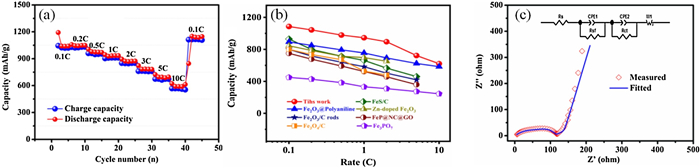 | Fig. 4. (a) Rate performance at various current densities from 0.1 C to 10 C. (b) The Ragone plots of this multiphasic nanocomposite and these reported Fe-based anodes. (c) EIS in the frequency range from 0.01 Hz to 100 kHz. | |