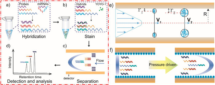 | Fig. 1. (a–d) Schematic illustration of detection and analysis for multiple miRNAs in the pico-HPLC-LIF system. (e) Schematic illustration of hydrodynamic chromatography model. (f) Mechanism of wall-layer electrostatic interactions. | |
