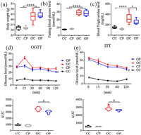 | Fig. 1. The effects of chronic treatment of db/db mice with PPARδ agonist GW501516 on (a) body weight, (b) fasting blood glucose level, (c) total blood triglyceride level, (d) oral glucose tolerance test (OGTT) and (e) insulin tolerance test (ITT). *P < 0.05. ****P < 0.0001.#P < 0.01. CC, db/m+ control; CP, db/m+ treated with GW501516; OC, db/db control; OP, db/db treated with GW501516. AUC, area under curve. Results are means±SEM, n =9. | |