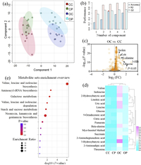 | Fig. 2. GC-MS analysis of plasma samples. (a) PLS-DA score plot with red dots representing db/m+ non-diabetic mice (CC), green dots representing db/m+ mice treated with GW501516 (CP), dark blue dots representing db/db mice (OC), and light blue dots representing db/db mice treated with GW501516 (OP). (b) Cross validation of (a). (c) Volcano plot between OC and CC. (d) Heatmap of differentiated metabolites in CC, CP, OC and OP groups. (e) Pathway enrichment analysis of discriminated metabolites between OC and CC groups (generated from MetaboAnalyst 4.0). FC, fold change. Isoleu, isoleucine, Leu, leucine, 3-HB, 3-hydroxybutyric acid. | |