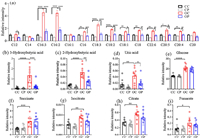 | Fig. 4. The effect of GW501516 treatment on plasma levels of fatty acids, ketone bodies, uric acid and TCA metabolites in db/db mice. C12, lauric acid. C14, myristic acid. C16:3, tri-unsaturated carbon 16 fatty acid. C16:2, hexadecadienoic acid. C16:1, palmitoleic acid. C18:3, α-linolenic acid. C18:2, linoleic acid. C18:1, oleic acid. C18:0, stearic acid. C22:6, docosahexaenoic acid. C20:5, eicosapentaenoic acid. C20:4, arachidonic acid. C20, arachidic acid. *P < 0.05. **P < 0.01. ***P < 0.001. ****P < 0.0001. CC, db/m + control; CP, db/m + treated with GW501516; OC, db/db control; OP, db/db treated with GW501516. Results are means±SEM, n=9. | |
