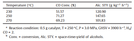 The catalytic performances of some representative catalysts reported are listed in Table S3 (Supporting information). Taking activity and selectivity into considerations, CuCo alloy catalysts prepared in our work show much better catalytic performance in terms of the conversion of CO and the selectivity towards C2+ alcohols.