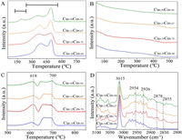 | Fig. 3. TPR profiles of H2 (A), TPD profiles of CO with temperature of 50-550 ℃ (B), 500-850 ℃ (C), and in-situ DRIFTS spectra (D) for CuCo catalysts with varying molar ratios of Cu/Co. | |