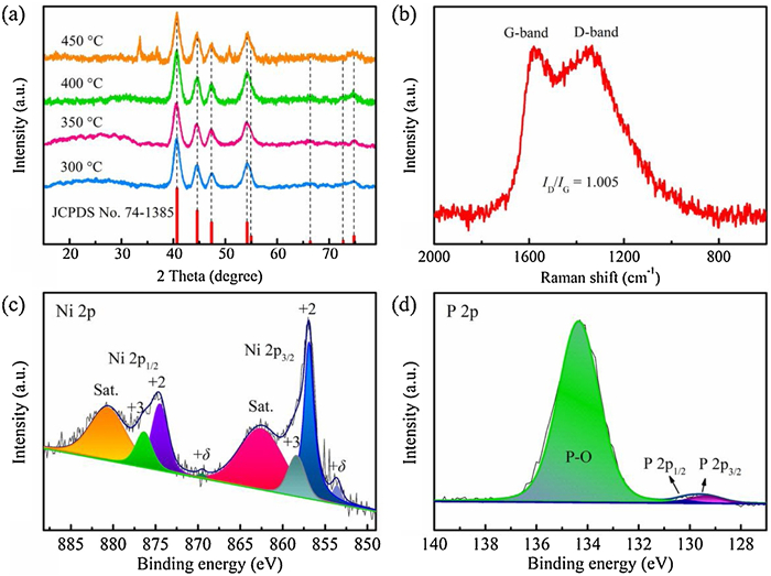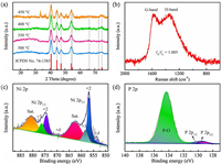 | Fig. 1. (a) XRD patterns of Ni2P/C-YS. (b) Raman spectrum of Ni2P/C-YS-350. (c, d) XPS spectra of Ni2P/C-YS-350 for Ni 2p and P 2p, respectively. | |