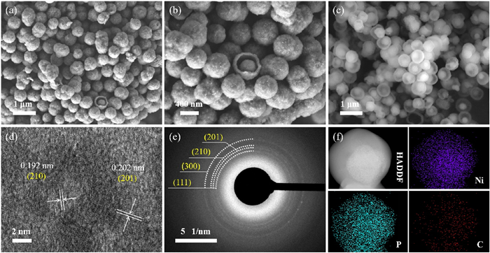 | Fig. 2. (a, b) low magnification and high magnification FESEM images of Ni2P/C-YS-350. (c) FESEM image of Ni2P/C-YS-350 at 15kV voltages. (d, e) HRTEM image and SAED pattern of Ni2P/C-YS-350. (f) HAADF-STEM image of Ni2P/C-YS-350 and the corresponding EDS elemental mapping image. | |