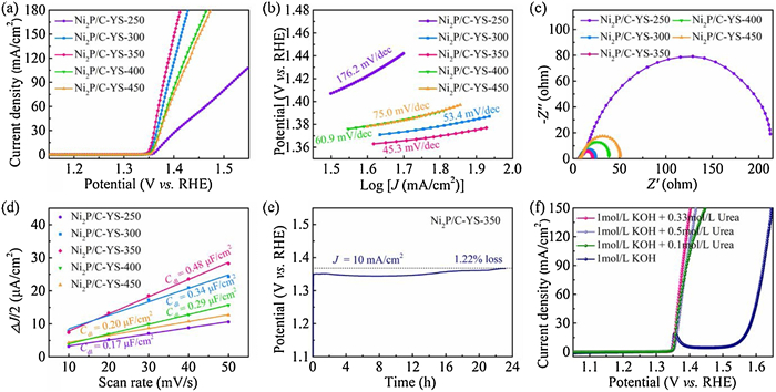 | Fig. 3. (a, b) LSV curves with iR compensation and Tafel slope curves of Ni2P/C-YS. (c) Plots of the current density (at 1.133 V) vs. the scan rate. (d) Nyquist plots of Ni2P/C-YS. (e) Chronopotentiometric measurements of Ni2P/C-YS-350 at 10 mA/cm2. (f) LSV curve of Ni2P/C-YS-350 under different concentrations of urea. | |