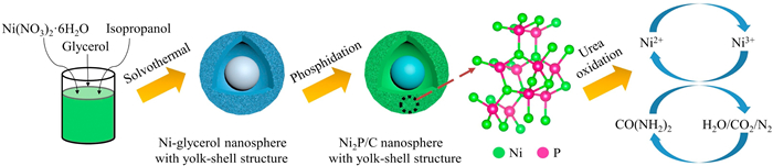 The typical synthesis route of Ni2P/C-YS and the catalytic process towards UOR is schematically illustrated in Scheme 1. Firstly, the york-shell Ni-gly precursor is well designed and fabricated via a one-pot template-free solvothermal method [31-33]. The formation mechanism of york-shell nanostructures is mainly due to the Ostwald ripening process [34]. Specifically, the solid nanospheres with rough surfaces are obtained after the Ni ions integrate with glycerol molecules. During the next stage of the solvothermal reaction, the inner cores are gradually separated from the nanospherical shell, and continue to shrunk. With the extended reaction time, the voids between the inner cores and outer shells are formed, leading to the formation of the hollow york-shell architecture. Secondly, the Ni-gly precursor is transferred into the Ni2P/C-YS after phosphidation treatment at a high temperature (see the experiment sections), still maintaining the york-shell nanosphere architecture.