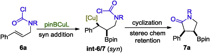 It is argued that the borocupration is a syn addition process that affords the syn intermediate INT-6/7 solely. The subsequent interception of the C-Cu nucleophile by the pendent carbamoyl chloride proceeds in a configuration retention fashion to accomplish the cis product 7a exclusively (Scheme 2).