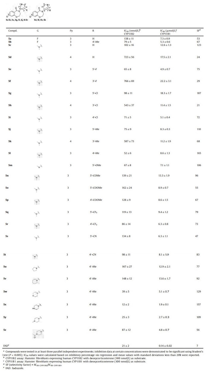 In contrast to the poor selectivity of the reference compound fadrazole (SF=7), all derivatives exhibited good selectivity over CYP11B1 with SFs of more than 50. Amongst them, six compounds (5j, 5l, 5m 5w, 5x, and 5y) exhibited both potent CYP11B2 inhibition (IC50 < 100 nmol/L) and excellent selectivity over CYP11B1 (SF > 100). Compound 5x distinguished itself as the most promising one with an IC50 of 12 nmol/L and a superior selectivity factor of 157.