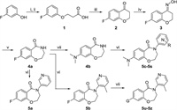 The designed compounds were substantiated via a concise synthetic route (Scheme 2). The starting material 3-fluorophenol was coupled with methyl 3-bromopropanoate, which was subsequently fused to the phenyl part forming a chroman-4-one scaffold (2) in an acidic environment. After it was converted into oxime intermediate 3, a Beckmann rearrangement was exploited to construct the 3,4-dihydrobenzo[f][1,4]oxazepin-5(2H)-one core. The flurobenzoxazepinone precursor 4a was then either inserted with pyridyl groups with or without a 4-methyl group resulting in compounds 5b and 5a, respectively, or transformed into N, N-dimethylamino intermediate 4b, which was consequently introduced with various substituted pyridyl moieties leading to final compounds 5c-5s under the catalysis of CuI. Similarly, the F group in compound 5b was replaced with amines in different sizes and capability in forming H-bond yielding compounds 5u-5z.
