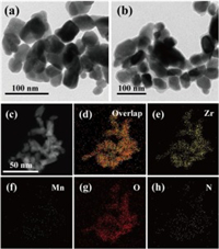 | Fig. 2. Typical TEM images of the (a) ZrO2 and (b) ZrO2@PDA NPs. (c) HAADF-STEM imaging and (d-h) the corresponding elements mapping of the ZrO2@PDA-Mn2+ nanocomposite. | |
