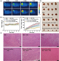 | Fig. 4. In vivo synergistic chemo-photothermal therapy of Tween-ZrO2@PDA-Mn2+/DOX. (a) IR thermal images of mice injected intratumorally with (I) PBS and (II) Tween-ZrO2@PDA-Mn2+/DOX (10 mg/kg). (b) Body weights of mice after various treatments. (c) Tumor volume changes and (d) images of excised tumor after 14-day therapy in every group (n = 4). (e) Representative H&E staining images of tumors for each treated group (scale bar: 50 μm). | |