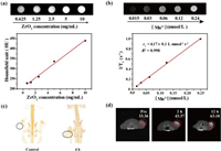 | Fig. 5. (a) In vitro CT images and the corresponding HU values of the Tween-ZrO2@PDA-Mn2+ nanocomposite at different ZrO2 concentrations. (b) T1-weighted phantom images with different Mn2+ concentrations (mmol/L) at 0.5 T and the linear fitting of longitudinal relaxation rates versus Mn2+ concentrations for Tween-ZrO2@PDA-Mn2+. (c) CT and (d) MR images in vivo before and after intravenous injecting Tween-ZrO2@PDA-Mn2+ nanocomposite. | |