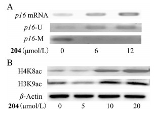 | Fig. 2. Compound 204 exhibited DNMT and HDAC inhibitory activities at cellular levels. (A) 204 induced the hypomethylation of p16 promoter and increased the expression of p16 mRNA. (B) 204 induced the hyperacetylation of histones H3K9 and H4K8 in U937 cells. p16-U, unmethylated p16 promoter; p16-M, methylated p16 promoter. | |