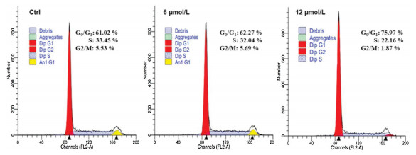 Furthermore, we measured the effect of 204 on the distribution of cell cycle using flow cytometry assy. The cell cycle profile of U937 after exposure to various concentrations of 204 for 24 h revealed that 204 induced G0/G1 arrest in a dose-dependent manner (Fig. 3). In fact, the G0/G1-phase fraction was increased from 61.02% in the untreated cells to 75.97% in the cells treated with 204 at 12 μmol/L.