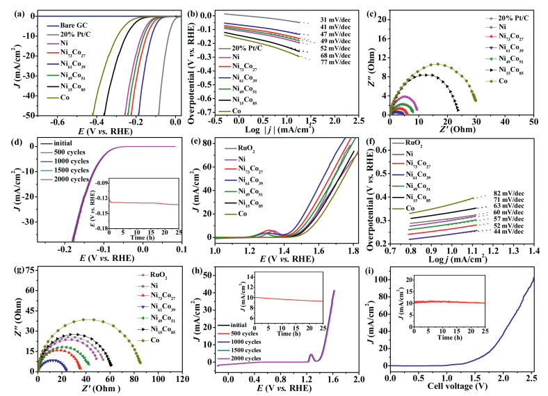 | Fig. 3. (a, b) LSV and Tafel curves for the NixCo100-x catalysts and 20% Pt/C for HER. (c) The Nyquist curves of catalysts recorded at -0.10 V. (d) LSV curves of Ni61Co39 catalyst for the HER initially and after every 500 cycles, inset: The chronopotentiometry curve obtained from continuous testing of Ni 61Co39 catalyst for 25 h at 10 mA/cm2. (e, f) LSV and Tafel curves for the NixCo100-x catalysts and RuO2 for OER. (g) EIS of catalysts recorded at 1.70 V. (h) LSV curves of Ni61Co39 catalyst for the OER initially and after every 500 cycles, inset: The chronoamperometry curve obtained from continuous stability testing of Ni61Co39 catalyst for 25 h at 1.47 V vs. RHE. (i) LSV curve of water splitting for the Ni61Co39 catalyst, inset: stability test at 1.60 V vs. RHE. | |