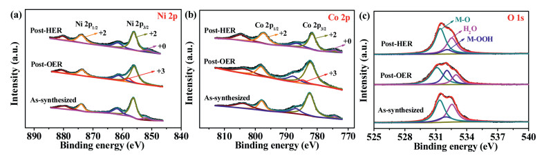 | Fig. 4. XPS spectra of the as-synthesized, post-HER and post-OER samples. (a) Ni 2p, (b) Co 2p, (c) O 1s. | |