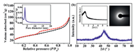 | Fig. 2. (a) N2 adsorption-desorption isotherm of Ni61Co39 catalyst, inset: Pore size distribution curve. (b) The XRD pattern for the Ni61Co39, inset: Corresponding selected-area electron diffraction (SAED) and small-angle XRD. | |