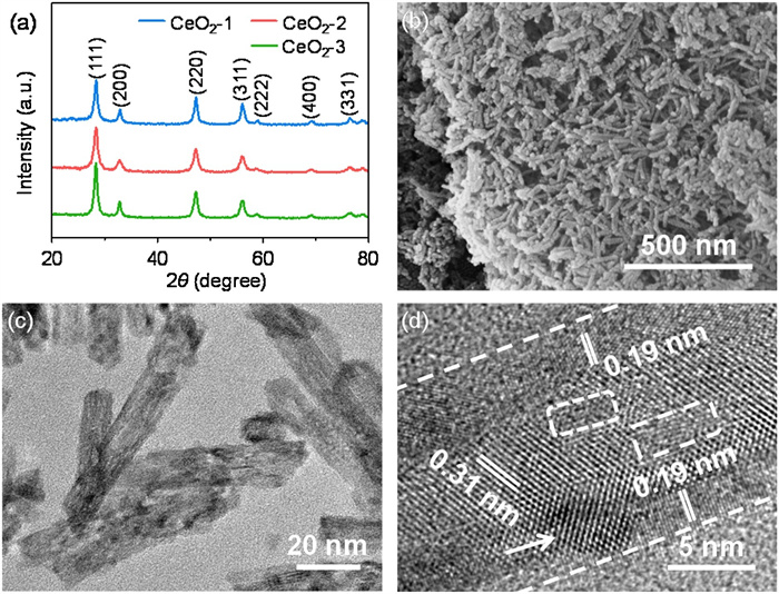 | Fig. 1. Structure and morphology. (a) XRD patterns. (b-d) FESEM, TEM, and HRTEM images of CeO2-2. The pore defects and nanoparticles are marked by white dashed rectangles and arrows, respectively. | |