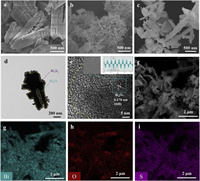 | Fig. 2. FESEM images of (a) Bi4O7, (b) Bi2S3, (c) BiS-0.15, TEM (d) and HRTEM (e) images of BiS-0.15, (f) FESEM images of BiS-0.15 and SEM-EDS elemental mapping of (g) Bi element, (h) O element, and (i) S element. | |